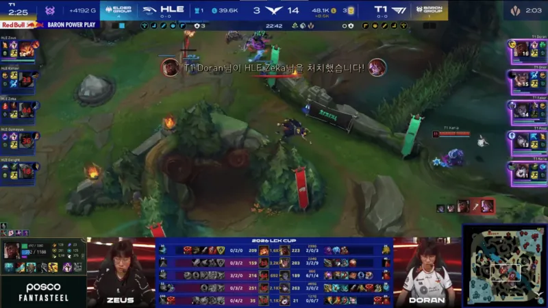 比赛第22分钟,T1抓掉Zeus纳尔后拿下大龙,随后中路打出0换4大胜HLE→